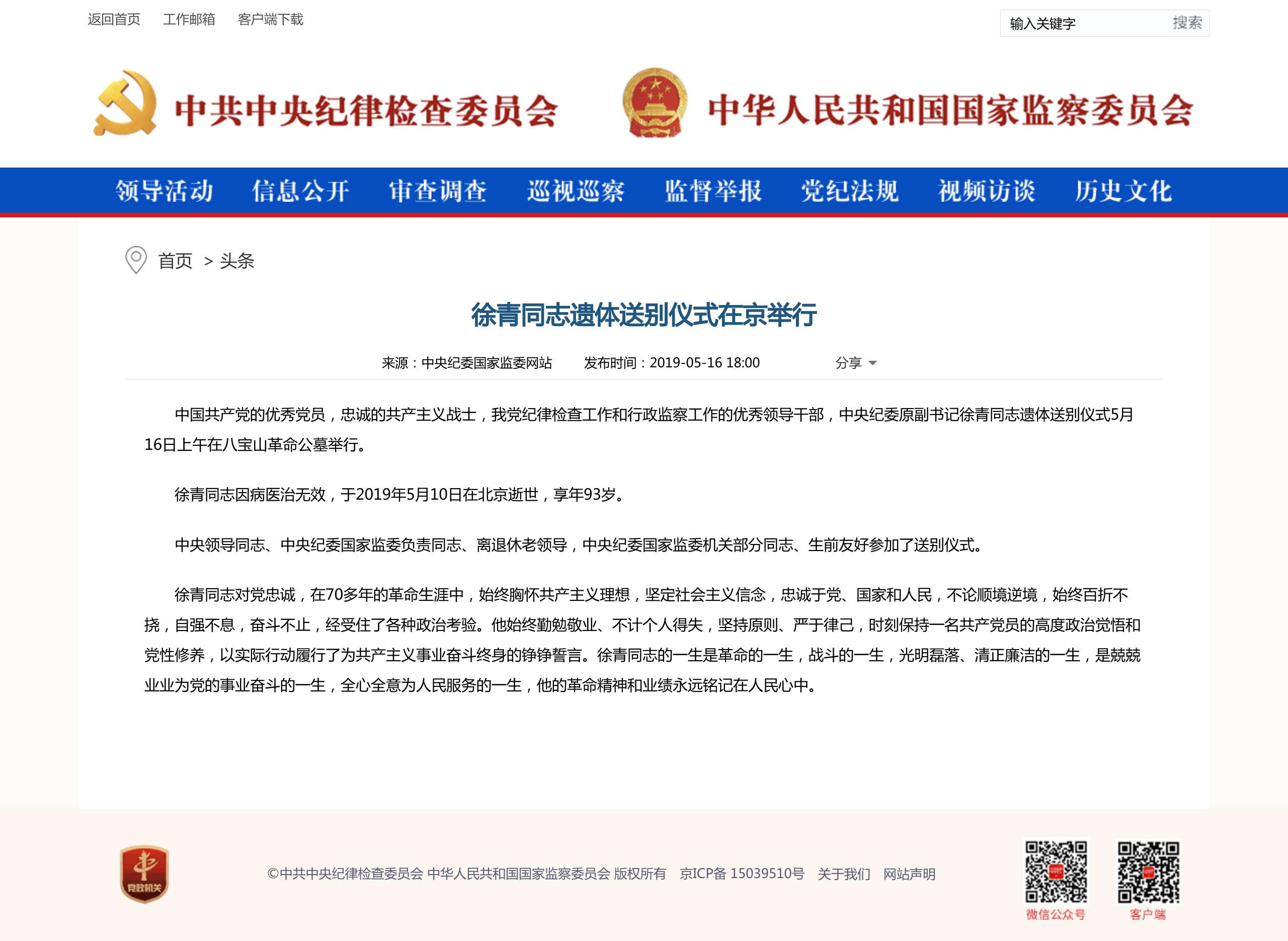 2019年5月16日上午,中国共产党的优秀党员,忠诚的共产主义战士,我党纪律检查工作和行政监察工作的优秀领导干部,中央纪委原副书记徐青同志遗体送别仪式在八宝山革命公墓举行。