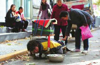破烂的外衣、脏乱的头发、灰蒙蒙的脸颊,不仅如此,更让人心生怜悯的是这些乞讨男子两只裤管下半截空荡荡的。西安街头不时能看到有“残疾”男子趴在自制的残疾车上,一边乞讨一边艰难爬……