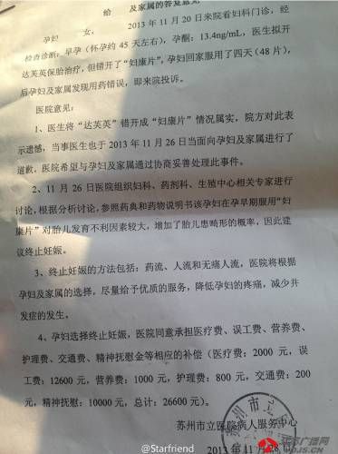 11月26号,在经过多位医生和专家会诊和全面检查后,医院方面通知陈女士夫妇,因为短时间大量服用“妇康片”,陈女士腹中的胎儿有较大几率产生畸形,建议陈女士放弃这个孩子,但对陈女士后期可能产生的后遗症却没有明确给出处理意见。在陈女士的一再要求下,苏州市立医院病人服务中心代表医院出了一份处理意见,在院方给陈女士的答复意见中,首先承认开错药的情况属实,并表示遗憾。同时建议陈女士终止妊娠,承诺在流产的过程中将尽量给予优质的服务,最后就是赔偿陈女士各项损失共计26600元。但这个意见陈女士及其家人却并不认同。