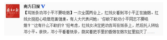 南方日报:【写纸条劝邓小平不要吸烟】一次全国两会上,红线女看到邓小平正在抽烟。红线女挺担心吸烟危害健康。有人大代表问她:“你敢不敢劝小平同志不要吸烟?”“这有什么不敢的?”经考虑,红线女决定把劝告写在纸条上,然后托人转给邓小平。很快,邓小平看着纸条,微笑着把手里的香烟在烟灰缸里掐灭了……