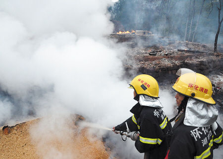 接到火警后,辰溪县消防大队紧急出动1台消防车、7名消防官兵,并调集红敏化工厂专职消防队赶赴现场救援。 均为柴均林 摄