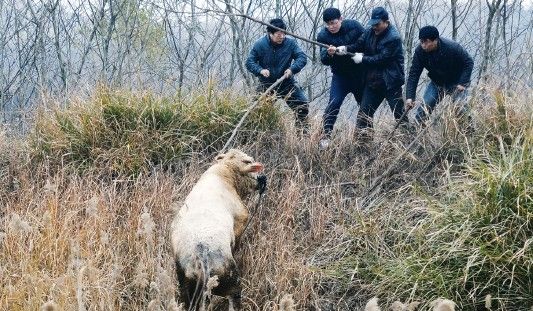 12月14日晚上9点多,蜀山区南岗镇梁墩村,一头重达700公斤的公牛被从车上卸下时逃出养殖场。昨日早上,在距养殖场四五里远的一处水塘边,养殖员找到了这头公牛。谁料,它在将一名养殖员两次顶翻后,向北逃入一处芦苇荡中。因担心惊牛攻击他人,养殖户报了警。昨日下午1点多,合肥市特警支队黑豹突击队民警赶到,将公牛击毙。