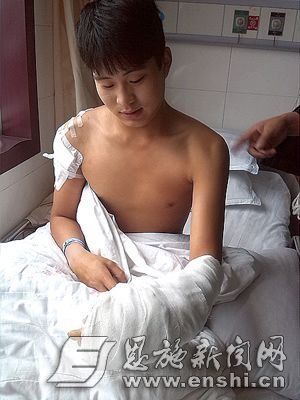 昨日下午,记者在医院见到住院的小俊。病床上的小俊,左手还打着石膏,裹着厚厚的纱布,背部和右肩等处受伤。