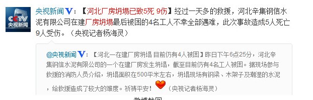 中新网12月28日电 据中央电视台新闻中心官方微博消息,经过一天多的救援,河北辛集钢信水泥有限公司在建厂房坍塌最后被困的4名工人不幸全部遇难,此次事故造成5人死亡9人受伤。