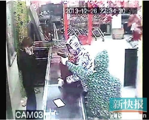 两名穿着套头羽绒服、戴着手套和口罩的男子高呼“抢劫”,突然从门外闯了进来。“他们一个左手拿枪右手拿斧头,另一个空手抱起黄金就往外跑。”目击者陈先生说,营业员当场就被吓懵了,而珠宝店的老板则反应迅速,翻过柜台就追了出去。