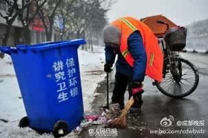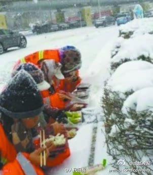 7日,辽宁大连大雪,环卫工王喜义夫妇整整除雪17个小时。衣服被打湿,饭也来不及吃,只能抽空啃几口馒头;渴得实在受不了,他们会吃雪解渴。
