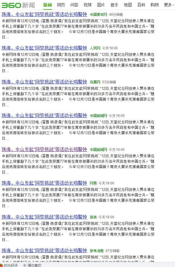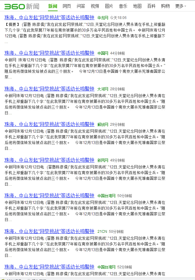 中新网珠海12月12日电 (冒韪 陈彦儒)“我在天堂纪念网发起‘网祭挑战’,”12日,天堂纪念网创使人贾永清在手机上郑重敲下几个字:“在此我祭奠77年前在南京被屠杀的30多万名平民百姓和中国士兵。”随后他将微信转发给被点名的三个朋友。