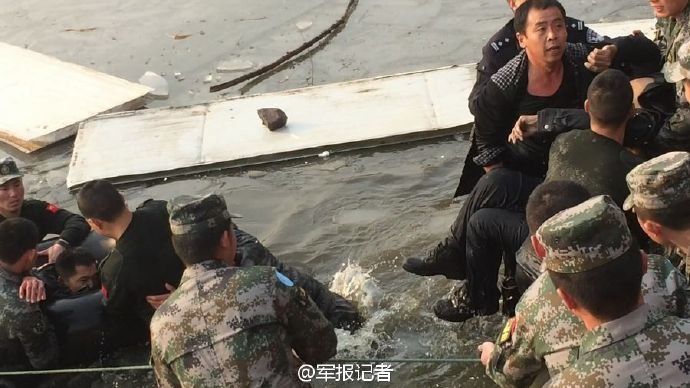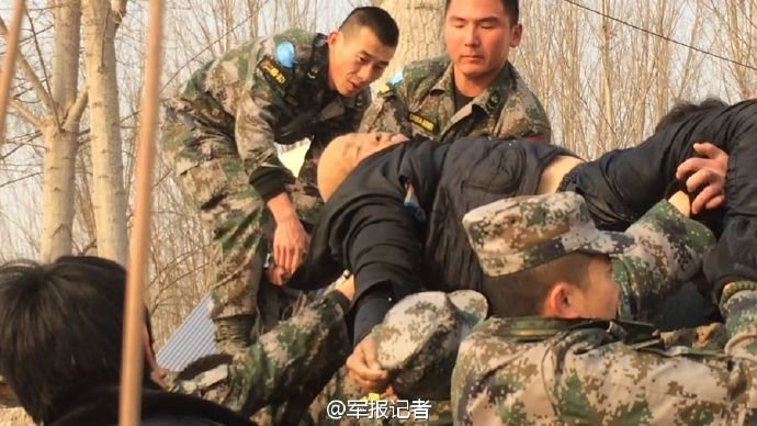 事发现场,众官兵正在设法营救群众。