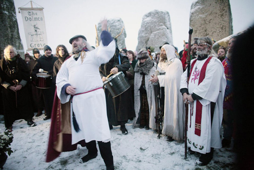 图为仪式表演。有考古学家认为,巨石阵是罗马统治时期德鲁伊教的祭祀场所。相传德鲁伊教在英国索尔兹伯里平原上建造了巨石阵,目的是用来献祭太阳神,从此在巨石阵的故事里出现了德鲁伊教。德鲁伊教是公元前5世纪至公元前1世纪,散居在不列颠、爱尔兰等地的凯尔特人信仰的一种宗教。据说德鲁伊教的形式和教义非常神秘,凯撒远征高鲁时说,德鲁伊教士精通物理、化学,他们在树林中居住,甚至用活人献祭。