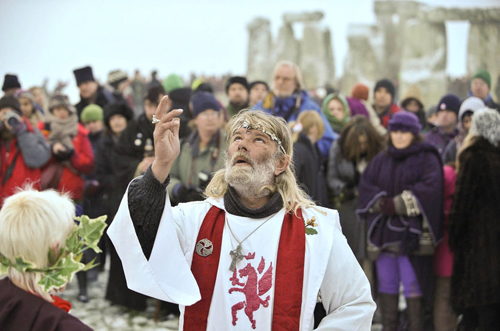 图为数百人穿上古代的服装在巨石阵表演远古仪式,迎接冬至。