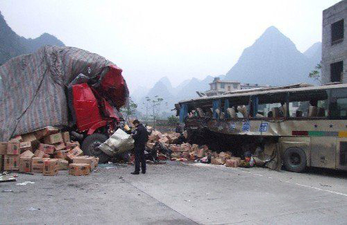 大客车与货车相撞现场
