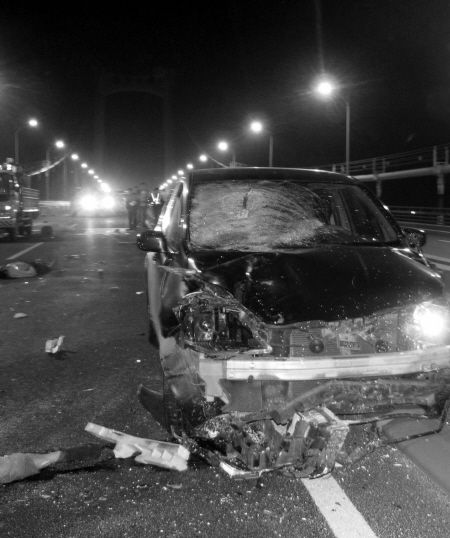 昨日凌晨0:40许,海沧大桥进岛方向中段发生了这样一起惨烈的交通事故。现场有人怀疑,该肇事司机是酒后驾车。目前,重伤的工人还在昏迷中,仍未脱离危险,交警部门正在对事故原因进行调查。