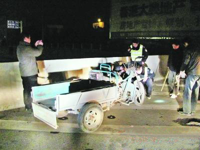 吉普车司机一脸无辜地告诉记者,他当时是在正常行驶,突然前面出现的小汽车一头撞在收费站的防撞水泥墩上,“小汽车的速度很快,撞水泥墩后车身还打转,车尾还撞上了我的车头”。打转后小汽车变成了车尾向前、车头在后地卡在收费站中间的车道内(上图,蔡弘摄)。