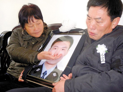 张宁海父母含泪抚摸儿子遗照 孙毅蕾摄
