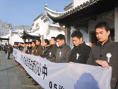 12月17日上午,黄山风景区管理委员会在黄山市殡仪馆举行张宁海烈士遗体告别仪式。张宁海的父母亲友,安徽省、上海市有关领导,以及复旦大学领导和师生代表,共1200多人参加了悼念仪式。