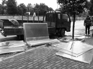 在附近工作的一位先生说:“事情怎么发生的,我们都没看到,听到有响声,出来看,小伙子已经躺在地上了。他不是平躺的,头靠在人行道上,侧躺在马路上,钢化玻璃压在他腰上面一点的位置。是我们几个过去帮忙把小伙子拉出来的,当时他已经不能说话了……后来听说,他半路发觉玻璃没捆好,下车来看情况,结果钢架绳子松了,钢化玻璃从货车上滑下来,压到了他。”