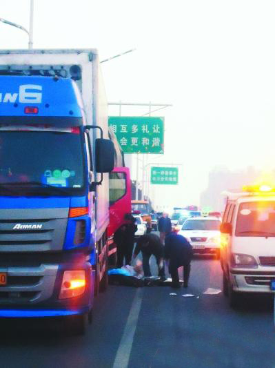 记者赶到现场时,看到后面的红色大货车留下了一道30米左右的刹车印,被撞男子正被人往急救车上抬,而急救人员遗憾地告诉大家,男子被撞身亡。