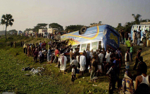2010年12月28日,孟加拉,Chandina:村民们在撞车现场围观。孟加拉国两辆客车迎头相撞,造成11人死亡。