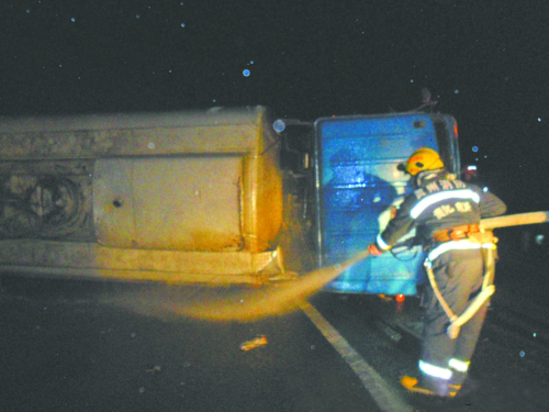1月7日凌晨,兰海高速公路贵阳往遵义方向息烽县将军山大桥附近路段发生一起交通事故:一辆运载着10多吨柴油的大型罐车行驶至此时,突然失控侧翻在地,罐体碰撞路旁护栏后破损,导致大量柴油外漏。经过消防、路政等多部门联合排险,2个多小时后,险情成功排除。车上3人,其中一名男子已经死亡,另外2人只是轻微受伤。