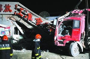 汽修店店主王师傅赶到现场,被吓出了一头冷汗:“幸亏今晚没在店里,要不真是性命不保了!”事发时,汽修店里有两名员工,店门敞开,但是已经不营业了,两名员工当时正在里屋上网,听到一声巨响,赶快跑出了屋,发现汽修店的半间房已经被完全撞塌。