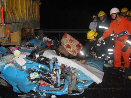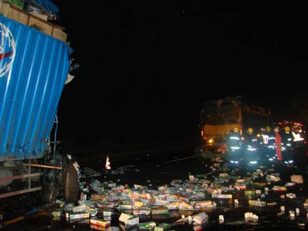 当晚8时50分,茂名消防特勤中队接到报警后,迅速出动了一辆抢险救援车和一辆泡沫车,及15名消防官兵赶往事故地点,发现一辆载有大量酸奶的大货与前面一辆载有钢筋的货车追尾相撞后,追尾的酸奶车驾驶室已严重被撞烂,1名司机和2名副驾驶员,倒在地上已一动不动,后经医护人员证实,三人均已死亡。