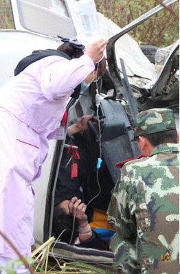 出事的轿车,车头及前轮轮毂已经严重损坏。面包车则严重变形,驾驶窗玻璃整块脱落,后厢车门大开,司机满脸是血,下身被凹陷的方向盘卡住,惠安县消防大队正利用液压扩拆工具救他。