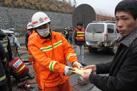 福银高速三明尤溪段往福州方向的B道已陷入瘫痪状态。救援人员冒着雨雪扛起救援器材赶往1公里外的十多辆车连环撞现场。在赶往现场的途中,他们又遇到了几个事故点,但发现无人员被困。“第二处现场一片狼藉,十几部车撞在一起,有好几个人被困在车里。”经过急救医生的仔细查看,其中3人已无生命迹象。“雨雪天,这样的长下坡很容易出事。”在采访中,几名老司机表示,事故发生后有关部门应该尽快进行交通管制,“特别是对大车、重车”。目前,事故原因还在进一步调查中,直到昨晚11点记者截稿时,该路段仍在封闭中。