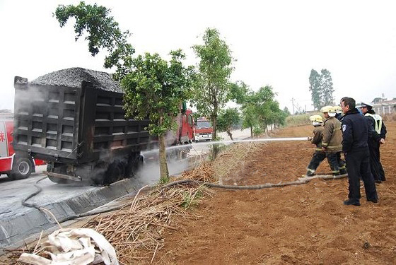 经过侦查发现,火势沿着车轮由车身尾部逐渐向车身前方蔓延,对泥头车的油箱部位带来极大的威胁;同时,泥头车车轮受损严重,整个车身已发生倾斜,随时可能出现翻车的危险。确认情况后,指挥员果断命令泡沫水罐车攻坚组人员展开战斗,采取强攻近战的战术,首先将油箱处的火势扑灭,消除油箱处的隐患,再重点针对轮胎着火部位喷射直流水灭火,同时水枪手与车身保持一定的距离,避免车辆可能发生的侧翻带来的人员伤亡。经过5分钟的不间断射水,火势被迅速扑灭。但是车体依然处于高温状态,战斗官兵继续对重点部位进行冷却射水直至其降至正常温度,以最快的速度结束了整个战斗。尽管救援迅速,事故还是造成一人死亡,事故原因还在进一步调查之中。