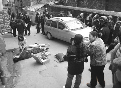 昨日下午,记者接到市民报料称,能仁寺社区有人跳楼,记者随即赶到了事发现场,死者的妻子曹女士正抱着丈夫的尸体在哭,死者头部下面有血迹。据市民宫女士介绍,昨日14时10分许,她从华美楼旁边的巷子里路过,突然听到后面传来重物掉在地上的声音,“当时我被吓倒了,幸好我走得快了点,要是慢点就被砸到了。”宫女士说,当她回头看时,发现一名中年男子躺在地上,鲜血直流,当时她就吓懵了,赶紧拿起电话报警。