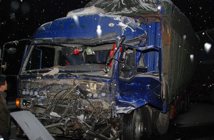 第一个事故是三辆大货车相撞,其中两辆货车内的司乘人员已全部出来,另一辆货车的驾驶员被困在驾驶室内,满脸血迹。