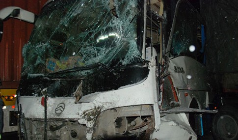 在距离该事故现场七八十米的路段还发生了一起更为严重的事故。一辆集装箱车和一辆挂车把一辆大客车挤在了中间,三辆车并排横在高速公路上。
