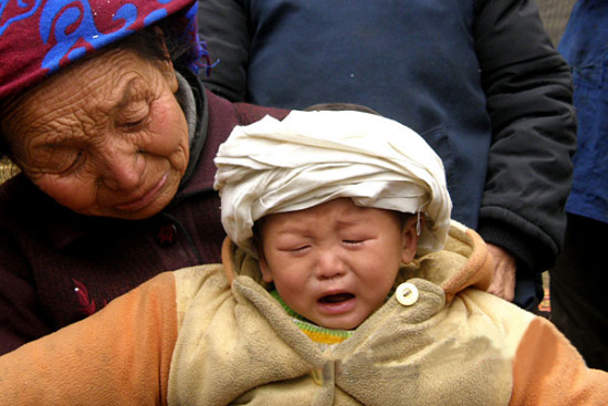 14日,郭永志的母亲抱着9个月大的孙子,在灵堂前痛哭流涕。图/成都商报