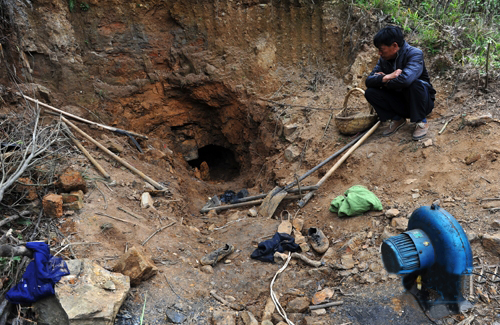 小煤窑的洞口不大,只有1米多高。坍塌的石块和泥沙已经把洞口堵死,村民们拿着锄头、铲子、簸箕一直往里挖了三四米。