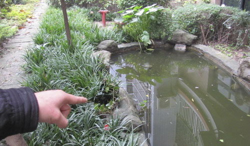 昨日下午1时许,记者接报后赶到丽江明珠小区9号楼下看到,现场围聚着不少群众,并指指点点地小声议论着:“他也许是从楼上掉下来撞在钢喷水头上的。”记者看到,现场的水池里有尖锐的钢喷水头,旁边的水草有明显的被重物压过的痕迹,旁边的小桥和便道上还有少许血迹。