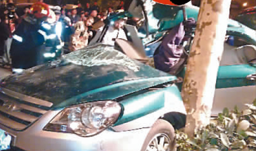 昨日22:10,张先生来电:秋涛北路和机场路交叉口,一辆公交车和一辆出租车相撞,出租车撞到一棵树上去了,现在车子和驾驶员都被卡在树上,现场有很多警察。
