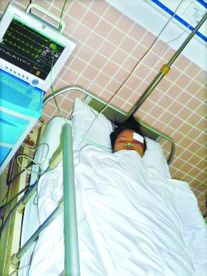 昨日上午11时许,记者在石排人民医院住院部3楼的病房里见到被撞伤的胡李玲。她双眼肿起,左额上贴着一块纱布。见到记者进来,胡李玲只能勉强睁开右眼,不能说话。