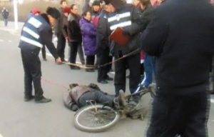 11时30分许,记者在现场看到,一名老人头部大量出血躺在路边,老人的下肢被自行车压着,经120急救人员证实,这名老人已经死亡。距老人约一米处,一辆金杯面包车驾驶员一侧车门有很长的刮痕。