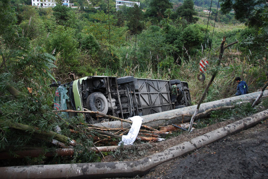 2011年12月7日,一辆贵州大客车沿210国道从河池往南丹方向行驶,在广西南丹县车河镇坡前村路段超车时与对向的一辆重庆大货车发生碰撞,大客车翻下右侧约10米深的路坎下。车辆四脚朝天严重变形。