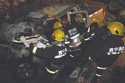 两辆车体严重变形。接到报警后市县120、交警、公安消防抢险救援车辆和人员分别在最短时间赶到事发现场。他们借助抢险救援车提供的现场灯光照明,利用破拆工具组对变形车体实施破拆,并利用液压扩张钳提供救援空间,奋力将困在车内的死伤者迅速救出并送往医院。部分重伤患者被送至西宁市区医院抢救。19时14分,最后一名被困人员被救出车外。根据现场情况初步判定,此次事故造成3人当场死亡,13人受伤。截至晚上十点钟,交警和消防人员仍在清理事故现场,现场已在早些时候恢复通车。