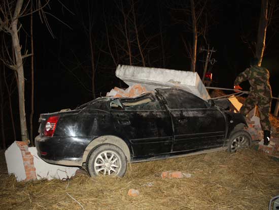 消防官兵在现场看到,建在路边的这所哨卡已被小轿车撞塌,哨卡内的部分办公设施立在废墟中,现场一片狼藉。牌号为皖C5B893的小轿车被一块重约1吨的大石板压成铁饼状。