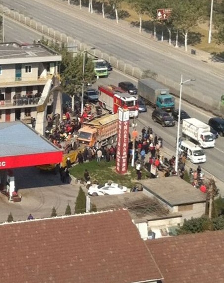 事故地点位于龙吴路近罗秀路附近。据目击者称,中午12时许,一辆车身喷涂成黄色、满载砂石的大型土方车在右转进入加油站时,将正在非机动车道上行驶一辆助动车撞倒,两名骑车人倒在血泊中。