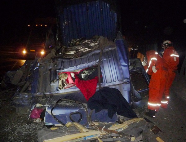 事故发生后,交警、医护人员、救援消防官兵迅速赶往事故现场救援,经医护人员现场查看,3名被困者已无生命迹象,确认已经死亡。为尽快将遇难人员抬出,确保高速公路恢复畅通,消防救援人员利用撬棍、消防斧、液压扩张器等破拆工具,对严重变形的驾驶室进行破拆,经过近1个小时的努力,三名遇难者被成功救出。