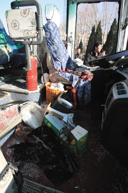 从庄河开往大连的大客车的左侧车身破损严重,左前胎爆裂,左侧车身一些部位的铁皮被刮掉,左侧的车窗更全部破碎。车内右侧乘客安然无恙,左侧不少座位上都沾染了受伤乘客的血迹。大客车内鸡蛋、货物、碎玻璃等散落一地,一片狼藉。