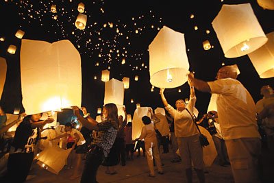 2009年,泰国普吉岛举办烛光晚会,放天灯纪念海啸遇难者(资料图)