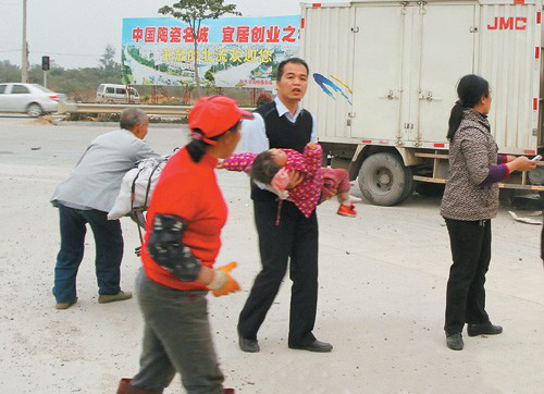 几名纪委干部赶紧奔过去施救。赵歧阳和何传水先从货车右前轮下抱起小女孩,小女孩双目紧闭、手脚冰冷。有急救经验的何传水,立即按住小女孩的人中,十几分钟后,小女孩舒了一口气,苏醒了过来。赵歧阳抱着小女孩叫司机小李开车向医院疾驰而去。