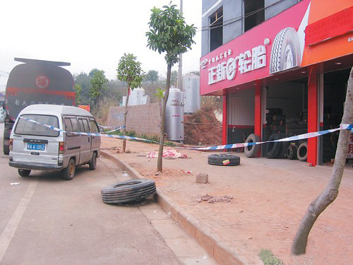 当天下午3时许,一辆大型油罐车停在玉洞收费站出口附近,油罐车旁是一家某品牌轮胎店,店门外布置起警戒线,民警已取证完毕离开了现场。警戒线里躺着一名男子,其遗体被一块布覆盖着,身旁摆着两个汽车车轮,其中一个车轮轮胎的钢圈出现开裂的痕迹。从现场可以看出,这两个车轮是从油罐车上拆卸下来的。