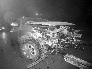 在出事地点附近长达几百米的路面上,散落着车辆掉落的各种零部件。轿车被撞得面目全非。