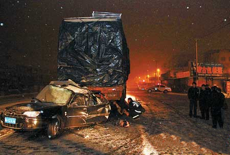 当日零时30分许,天上飘着小雪,事发路段路面湿滑。挂伊犁牌照的红色大货车停在路边,黑色轿车挂乌市牌照,车尾撞掉大货车左尾灯,车身大半挤进货车车尾,左后侧车壳凹进后排座位里,车尾变形的铁皮包裹着气罐,车顶掀开,车玻璃全碎。交警、消防人员均已在现场。