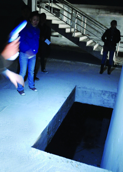 昨日中午,记者回访事发现场,发现此楼有玻璃封门,但有一口子可进入,顺着楼梯走下去,到底层即负三层。老人尸体被发现后,管理层紧急派人排查安全隐患,将这个口子用铁棍封死。记者在现场确实没有发现任何防护措施,也没有张贴警示告示。从负1楼到负3楼,被砸了一个大洞,稍不留神,就有可能掉进去。大洞最下面就是一个电梯井口,下面就是事发的污水池。污水池面积约几平方米,水深1米多。