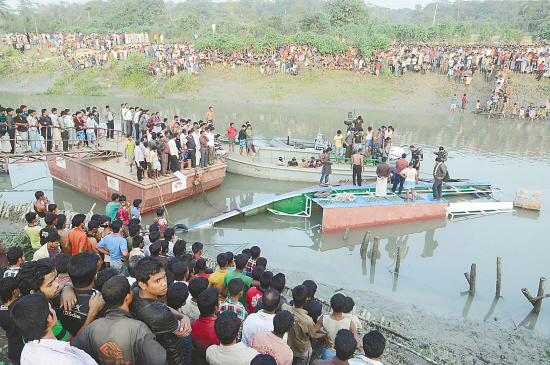 1月5日,一艘超载的渡轮在孟加拉国吉大港倾覆,造成至少5人死亡、多人失踪。图为人们聚集在渡轮倾覆事故现场。